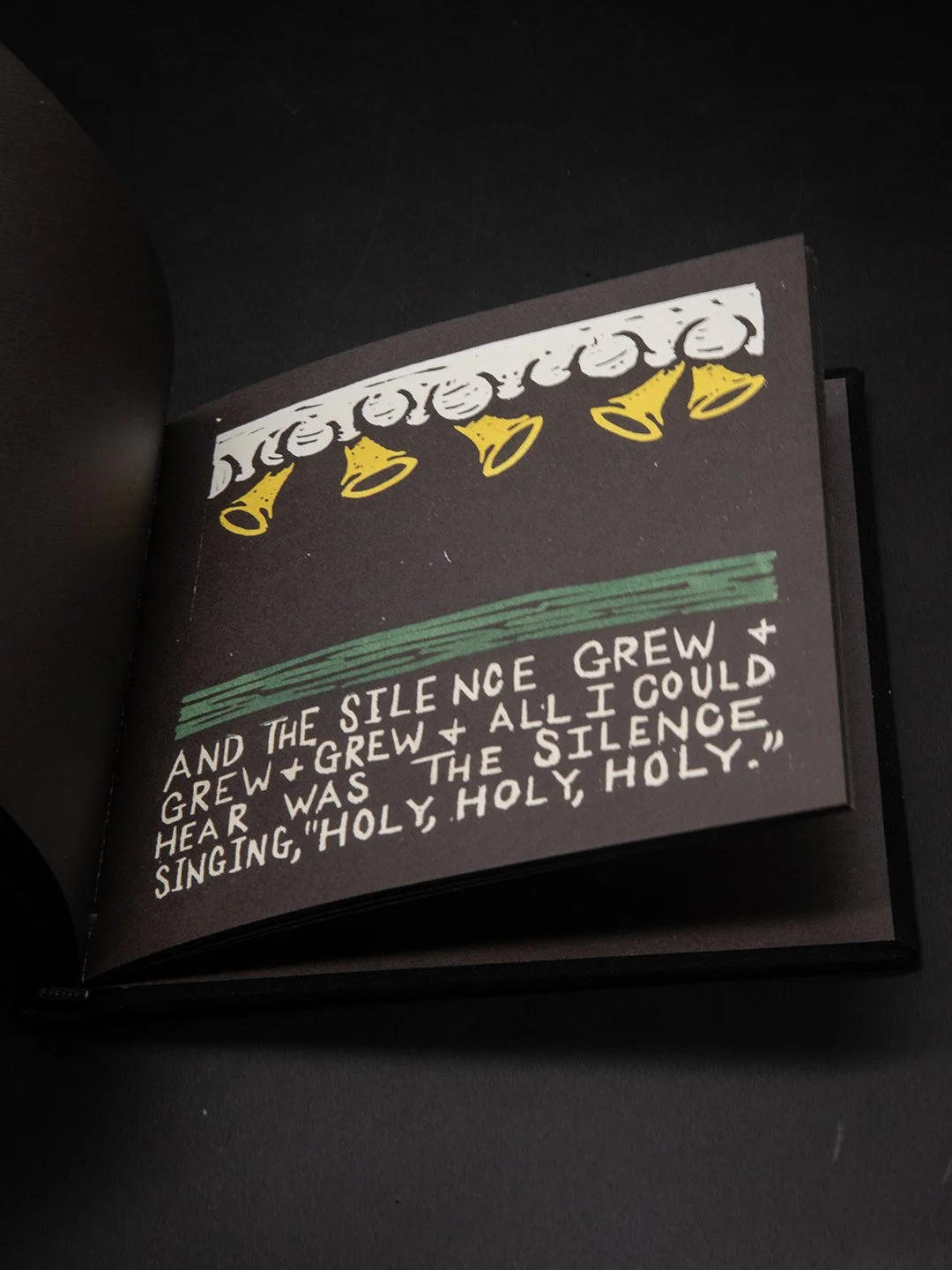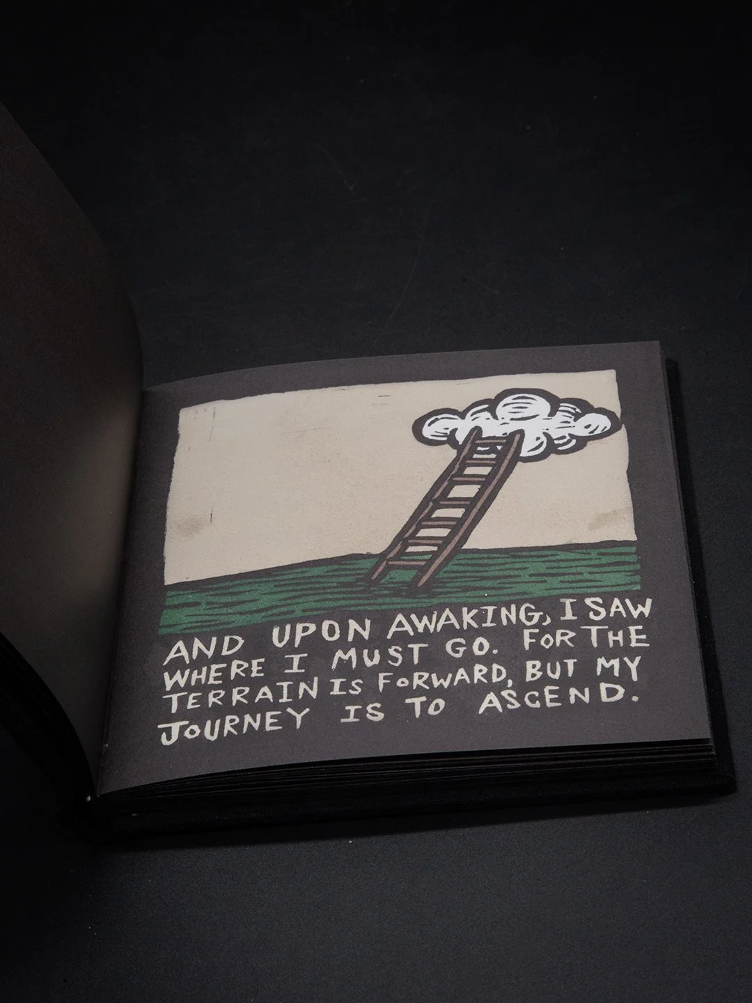 AN ETERNAL EXODUS OF UNVEILING was originally written and sketched out over a span of three short sittings. Each image with text was carved and printed through a traditional printing press and individually hand-painted.